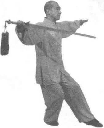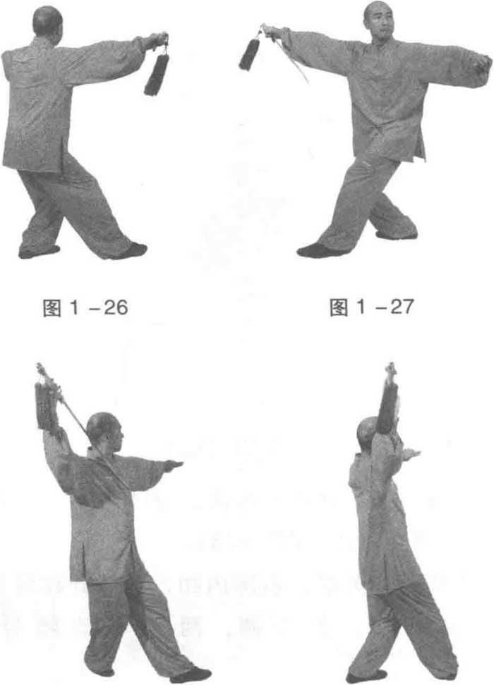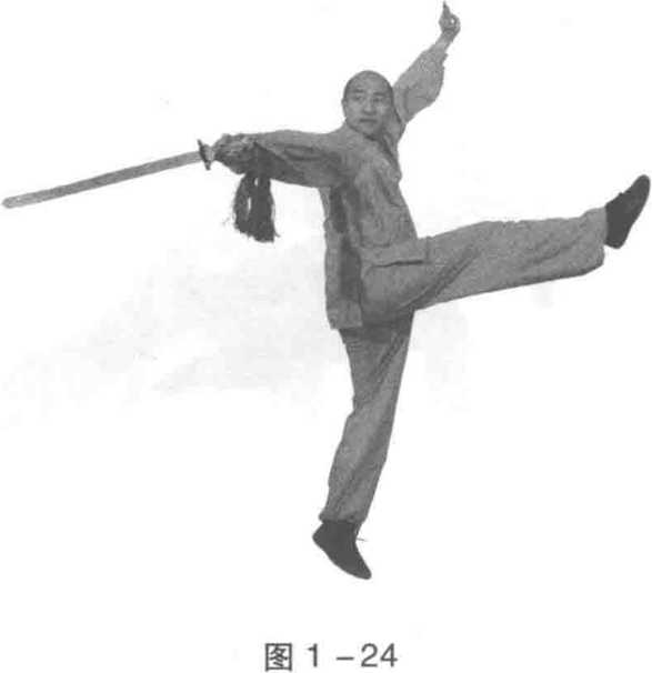 向上,剑指剑尖同向右后。头向后摆,目视剑尖 (图 1-24)。