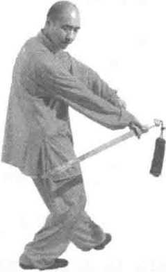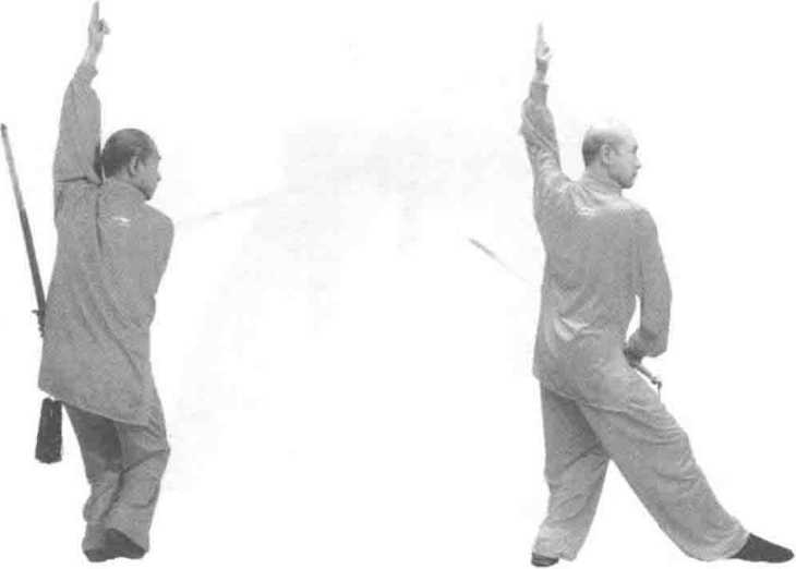 【要点】撩剑时,剑随身走,身体高低起伏流畅, 身械合一,行步走成弧形。