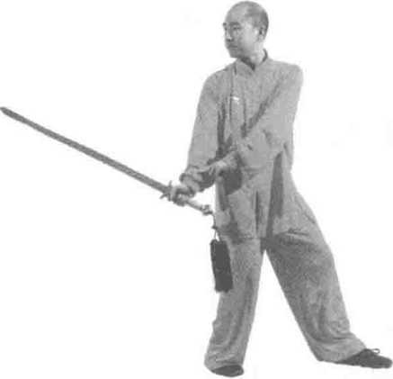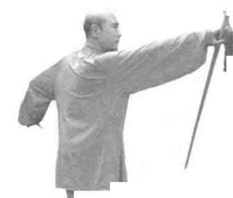【要点】剑划圆贴身,行步平稳,行步三步要走成 弧形。整个龙形虎步要走成S形。