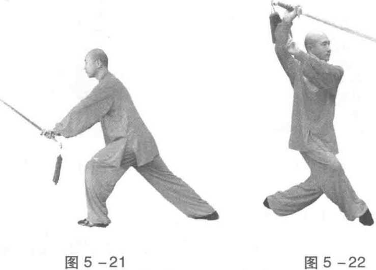 持剑,撩至右上方,剑尖向左斜下方。目视前方(图 5 -21、图 5 -22)。