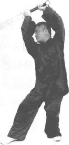 1 .右虚步架刀(左分鬃 式)。重心后移,身体向左微转, 右脚微收成右虚步。两手握刀向 左上方拉举于左肩上方,左手心 向外,右手心向里,使刀斜托举 于身前,刀刃向上,刀尖斜下 45 度(图 4-4)。