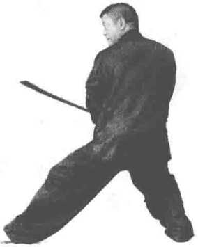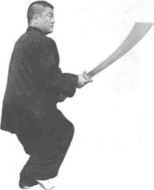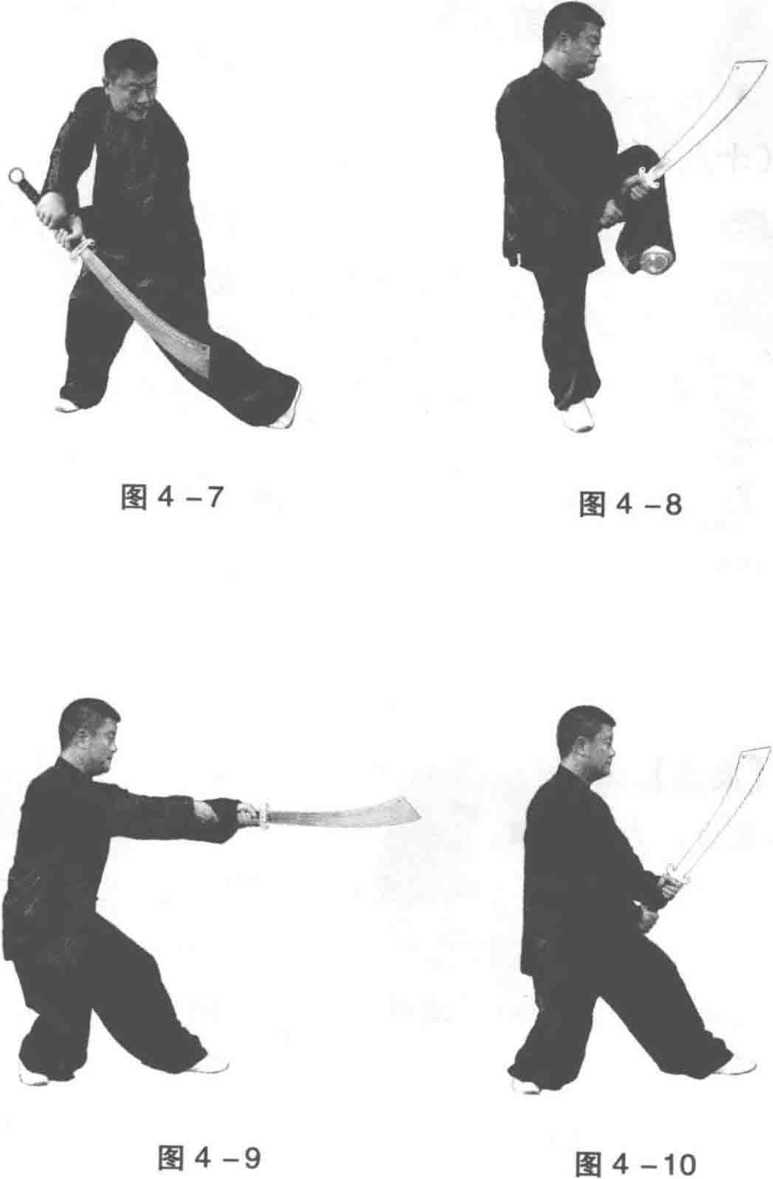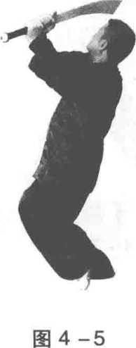 2 .右脚后撤成三体桩步,同时两手向下猛带于小 腹前,使刀背向后绷挂,刀尖斜向上45度,目视刀尖 (图 4-10)。