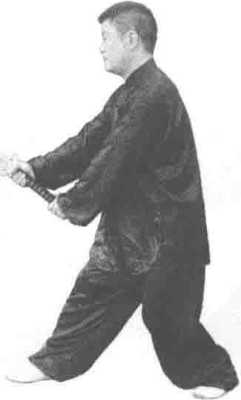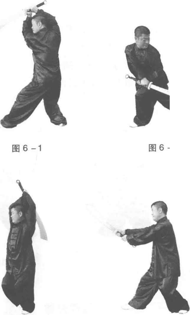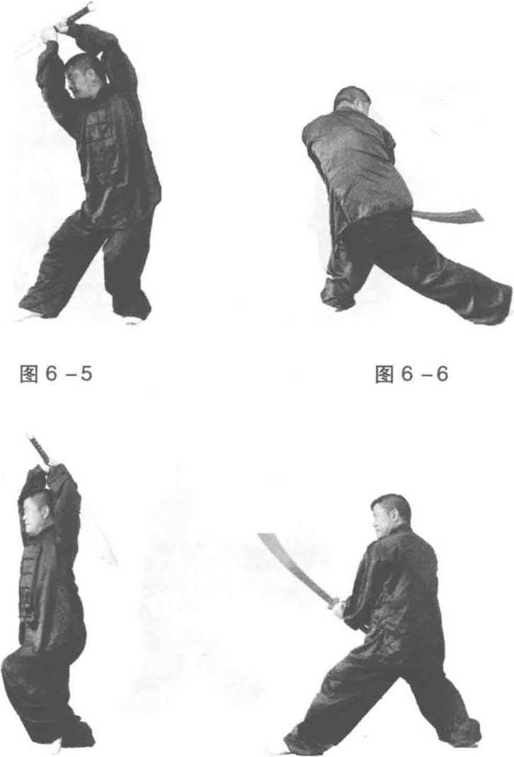 (二十二)右劈刀同前第一段第(二)动,动作相同,方向相反 (图 6-1、图 6-2、图 6-3、图 6 - 4)。(二十三)左劈刀同前第一段第(三)动,动作相同,方向相反 (图 6-5、图 6-6、图 6—7、图 6 - 8)。(二十四)右崩刀同前第二段第(六)动,动作、方向完全相同(图 6—9、图 6-10、图 6 — 11) 0图 6 -9 图 6 -10图 6 -11