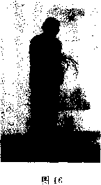 ② 右手从右头维穴向下走,经U唇右角地仓穴,再经胃 部、腹前斜行至左环跳穴;目视生下方(图16)