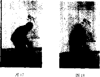 ①右手绕过左脚尖、再经右脚尖至右脚外侧;日视" 手。然后忘掉右手想左乒。(图18)
