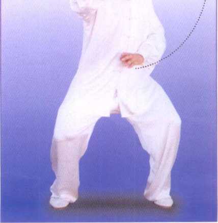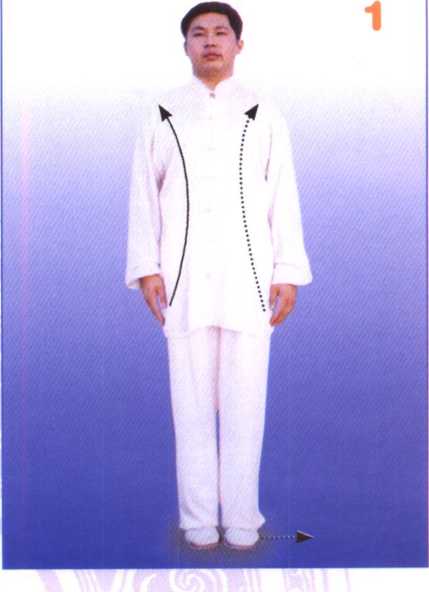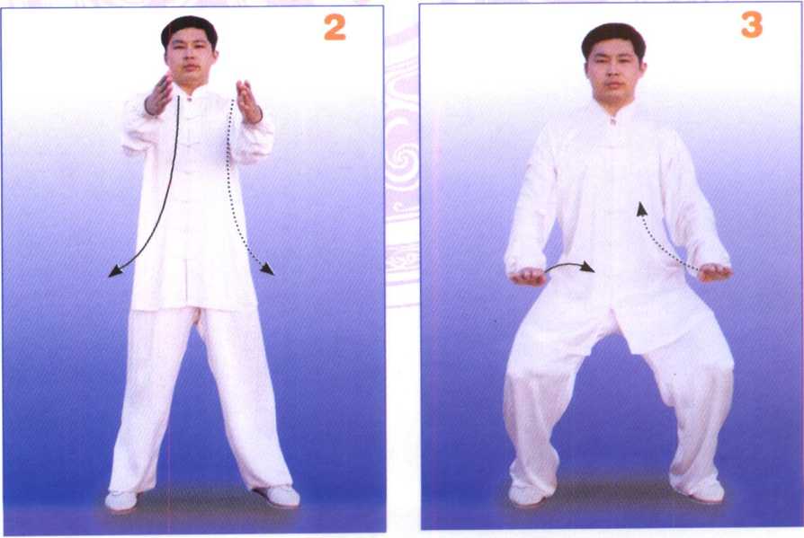 两脚并拢,身体自然直立,肩 臂松垂,两手轻贴两腿外侧,头颈 正直,两眼平视。身法不变。提起 左脚向左平行开步,与肩同宽。接 着,两手顺缠,向前向上抬起至肩 高,同肩宽,掌心相对,掌指向 前;两手变逆缠,掌心反向下,屈 臂下按至腹前;同时,两腿屈膝下 蹲,成马步双按势。(图1、2、3)