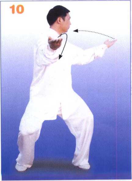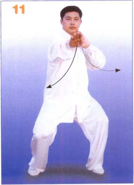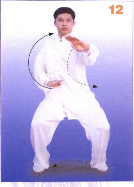身体右转,步型不变。左手继 续逆缠,向前经右臂上侧向前转 出,手同胸高,掌心斜向前下方, 掌指斜向右前上方;同时,右手继 续逆缠向下转至腹前,掌心向下, 掌指斜向前。眼法不变。(图12)