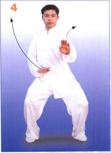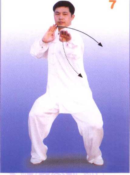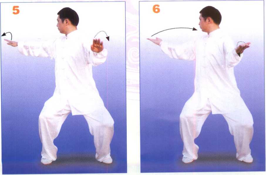 身体稍右转,步型不变。左手 逆缠向前转出至胸前,掌心向下, 掌指向前;同时,右手逆缠,向右 后斜上方转至肩高,掌心向下,掌 指斜向右后方,眼看右手;接着, 两手变顺缠,掌心反向上,随之两 手再变逆缠,右臂同时屈肘向内、 手至右腮侧,掌心斜向前,掌指斜 向上,左手在原处做逆缠旋转,掌 心向下,掌指向前。眼看前方。 (图4、5、6、7)