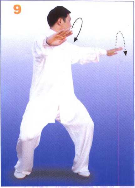 身体左转,步型不变。右手继 续逆缠,向前经左臂上侧向前转 出,手同胸高,掌心斜向前下方, 掌指斜向左前上方;同时,左手继 续逆缠向下转至腹前,掌心向下, 掌指斜向前。眼法不变。(图8)
