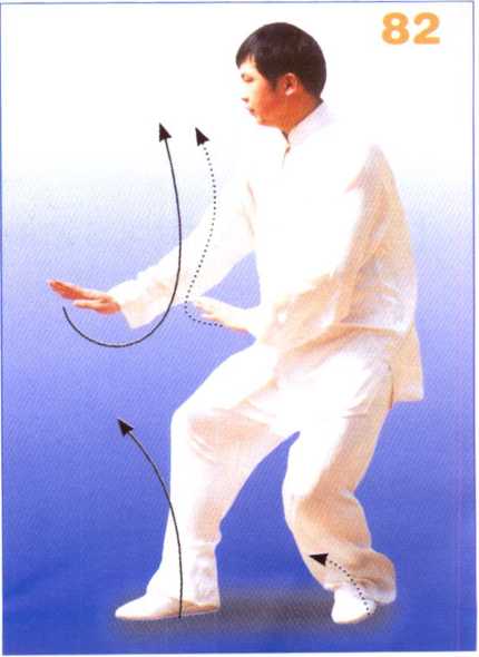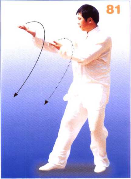 身型不变,左腿弓膝塌劲,身 体重心移向左腿,右腿稍向内收 转,成右前虚步;同时两手变顺缠 向内合至右侧腹前,右手在前,左 手在右肘内侧,掌心均向上,掌指 向前。眼看前方(图80)。