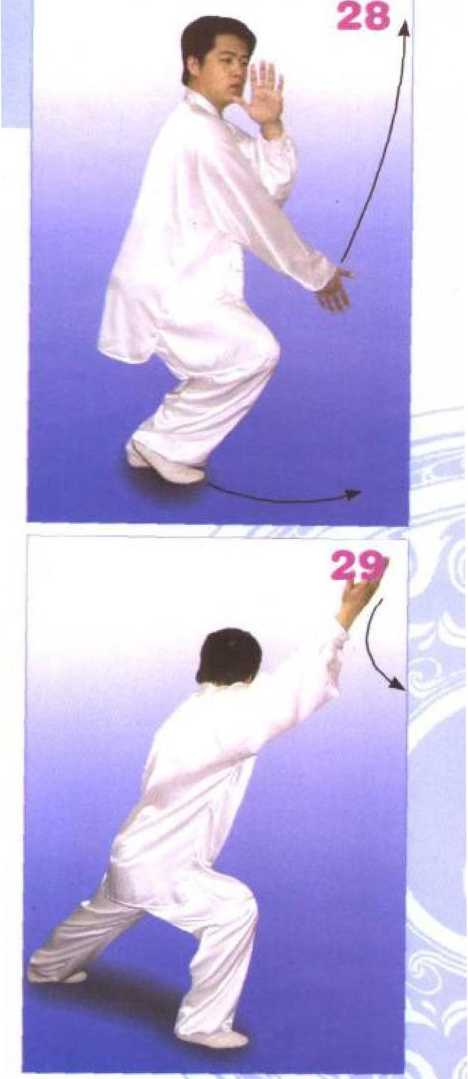 左脚落平,重心移向左腿成左 隅步弓势;同时左掌外旋成仰掌至 左上方,左臂伸直,肘尖微垂,手 与眼平,指尖斜向前;右掌向下、 向右微内旋成俯掌,松沉至右胯 旁,掌指斜向前,目视右掌,意在 左肩。(图27)