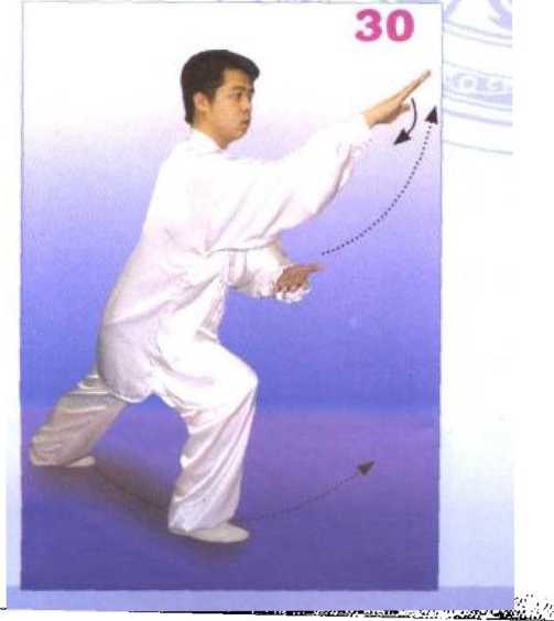 重心在右脚,左脚向前跟半步 在右脚内侧不着地,同时右掌内旋 转成俯掌,微前移舒伸至右脚沿长 线上方;同时左掌外旋成仰掌至右 肘下方,指尖斜向右,目经右食指 尖远视,意在掌心。(图30)