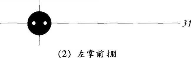 上动不停;左脚向左前方出步 成左隅步弓势;左掌经右小臂下穿 撷至左前上方,指尖向前,腕与肩 平;右掌随之,落于左小臂旁,右 大指遥对左臂弯,指尖斜向前。目 经左食指尖视前方,意在左掌心。 (图 31)