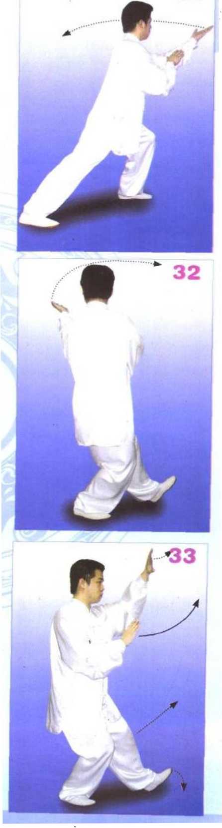 重心后移,左脚尖翘起成左虚 步;同时腰转,左掌后搠至左上方 西北时,腰右转,左掌内旋翻转手 心向前,反掌置于额上方;右掌外 旋成立掌,随左掌至右胸前,两掌 虎口相对。意在右掌心,目视前 方。(图32、33)
