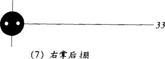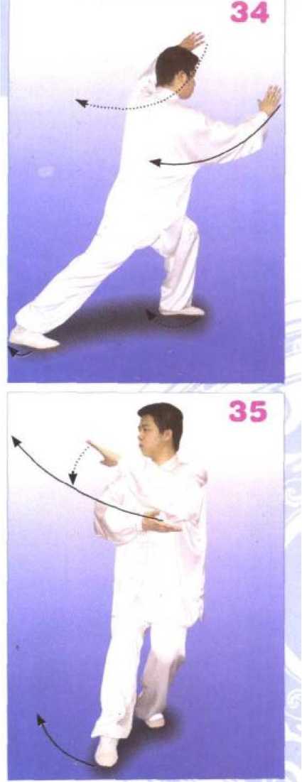 重心前移,左脚落实成左隅弓 步;同时右掌随重心前移向左前方 (东北)按出,左手随之,双掌虎 口仍相对,右腕与肩平,左腕略高 于头。目经右手远视,意在掌心。 (图 34)