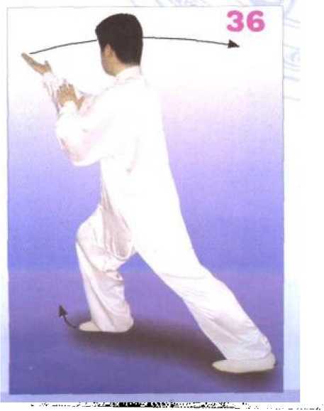 身体右转,右脚向右前方上 步,脚跟着地,屈膝前弓,同时左 脚跟外展,成右隅弓步;右掌随转 体穿至右前上方。其他动作,左右 对调,同本式(2)o (图36)