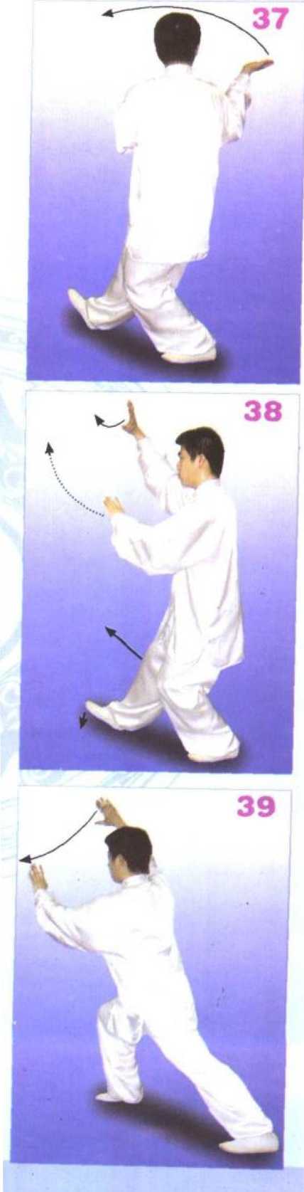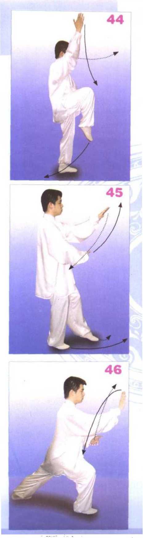 右胯、右膝微松沉,左脚向左 前方落步,脚跟着地,逐渐落平成 左隅步弓势;同时,左掌向正东下 落,腕与肩平,掌心向右成侧掌; 右掌外旋上移至左肘尖下方,指尖 向左成仰掌,目随左掌,意在右掌 心。(图43)