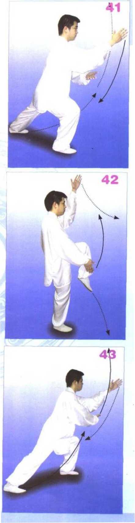 重心在右腿,提左膝,于左腹 前,脚尖松垂向下,成独立势;同 时,左掌贴右小臂向正前上方穿搠 至极度,掌心向右指尖向上;右掌 向下经左腕内侧,沉落至小腹前下 方,掌心向左成垂掌,目视前方, 意在左掌指尖。(图42)