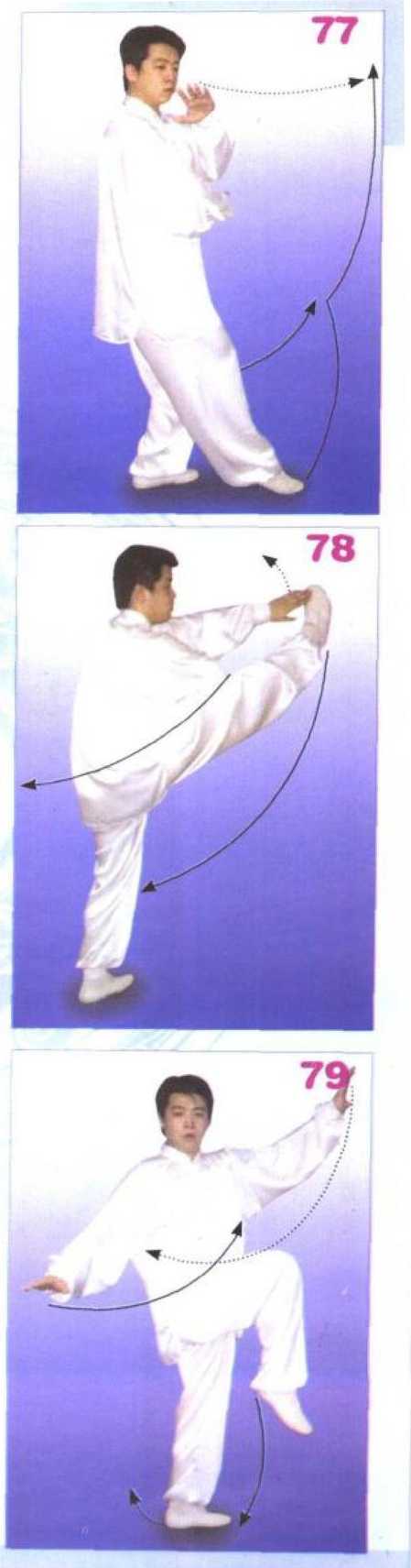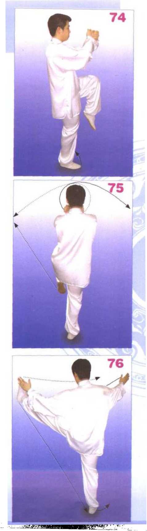 右腿仍独立,左膝松力,小腿 回收,脚尖下垂,膝高于胯;两臂 弯松力,左右掌外旋向身前方合抱 并渐握成拳,两腕相交(左腕在 外),腕与肩高,置于胸前,两拳 心向内。目视前方,意在左拳。 (图 74)