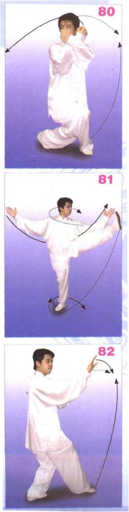 重心在右腿,提顶长身,右腿直立, 左腿提膝过腰,左腿以脚跟领劲小腿伸 展,向正东上方蹬出,(脚跟过腰);同 时两拳内旋向上舒伸与头平,变掌翻转 手心朝外过头,两掌自上而下展开劈落。 至两臂伸直,松肩沉肘,腕略高于肩成 侧掌,左臂与左腿上下相对,右手指尖 向西南。目经左掌远视,意在左脚跟。 081)