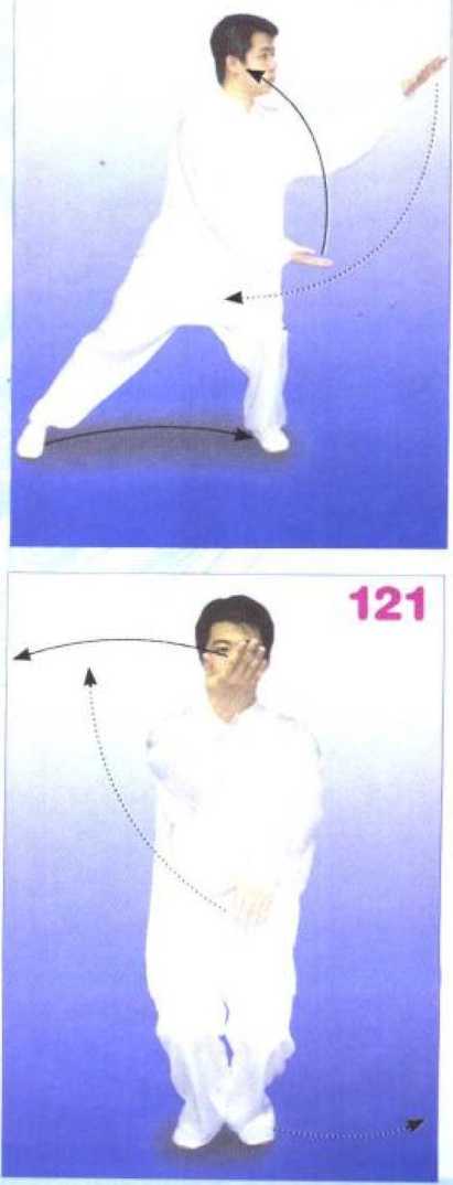 重心在左腿,右脚收至左脚 旁,脚掌着地后踏实,左脚向左横 开一步,成右侧弓步;右掌划弧经 左臂弯上方右前上方捋至身体右 侧,腕与肩平,掌指向右成俯掌; 同时左掌外旋划弧经左膝上方至右 膝上方,掌指朝右成仰掌,意在右 掌心。(图 121、122)