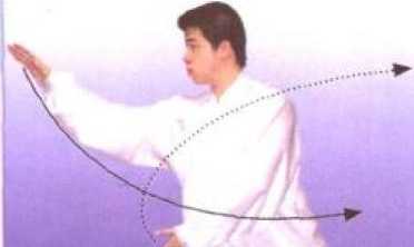 重心左移于左腿成左侧弓步; 左掌外旋舒伸松落至左下方,腕与 肩平,掌指向左成俯掌,同时右腕 松力,右掌舒指向下向左划弧经右 膝上方至左膝上方,掌心对左肘上 方成仰掌。视线由右手转移至左手 食指尖,意在掌心。(图120)
