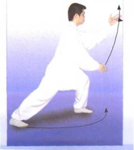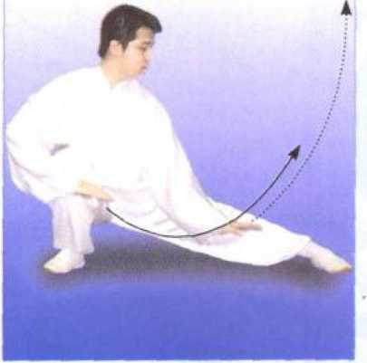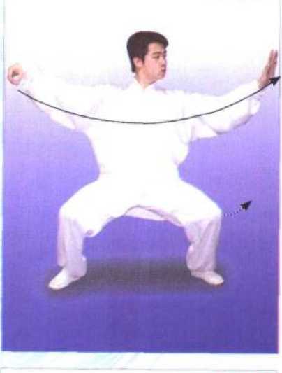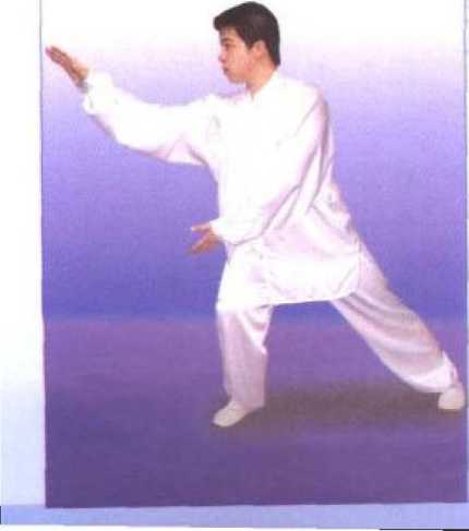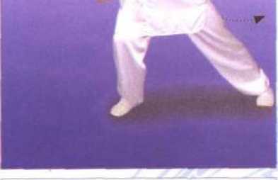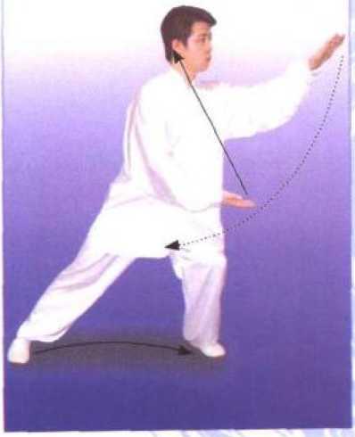 重心集于左腿,松右膝向正前
