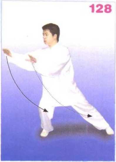 两膝放松;上体右转,重心移 至右腿,右腿下蹲,上体正直胸向 正南成仆步;同时,两掌内旋翻转 成俯掌随转体和身体下蹲回捋下 按,右掌置于右膝右前,左掌置于 左膝右前,掌指均朝向正东。目视 正南方,意在掌心。(图128、 129)