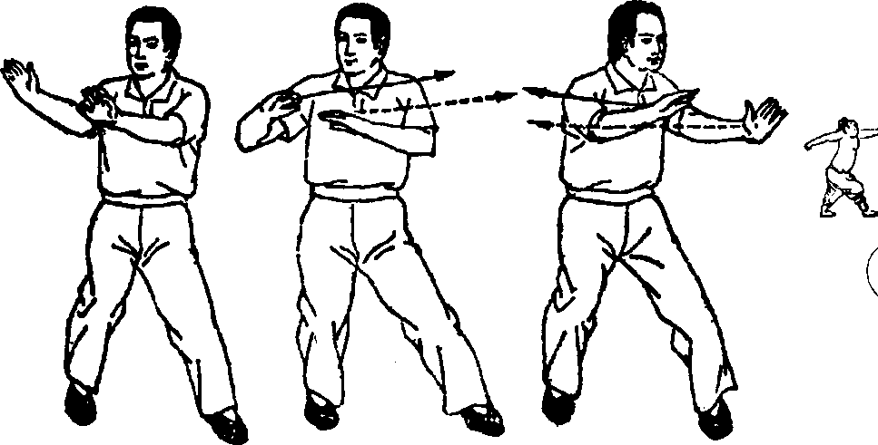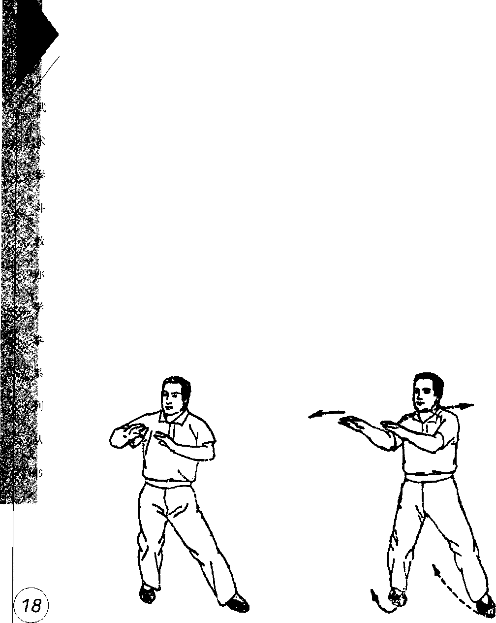 1 .按式双掌以等距离向左划半个平面椭圆形是一 蓄一发、一吸一呼;再往右划半个平面椭圆形,亦是一 蓄一发,一吸一呼。胸部和双手随腰运转,要有空松圆 活之趣,两掌的距离约三个平拳,两掌的运转与两小臂 运转的配合“主宰于腰”,可使推手变化多端,而对方不 易觉察。