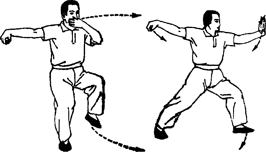 [动作7]腰、胯、身继续向左微转,使胸腹中线 对向左前45。°左足向左前(东方)迈出,先足跟轻着 地,随着重心逐渐向左前移动而左足全面踏实,足尖向 正前(东)方。弓左腿,蹬右腿,成左弓步。左掌微内 旋,使掌缘向外(东方),指尖高与下颔平,拇指距下颔 约四个平拳、一个立拳地位。随着腰胯微左转,掌缘微