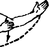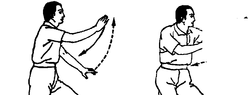 同时,右手随转体沉肘后移,小臂稍外旋含搠劲, 使右掌心翻向左。右掌随着稍向下向后以浅弧形收回,