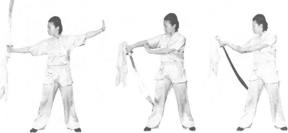 左脚向右脚后撤步,右脚向左脚右侧开步,上体左转180°,同时刀做背花刀 接左剪腕花后落于腰间,经腰间向体前扎出,左掌收至右肩旁,目视扎刀方向。 (图 400 ~ 图 404)