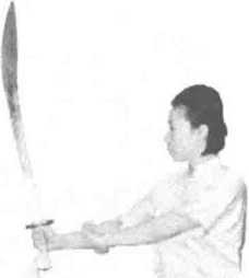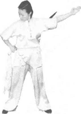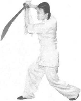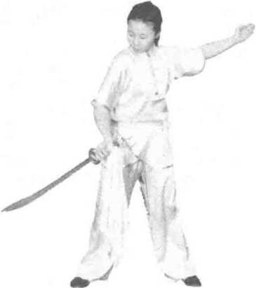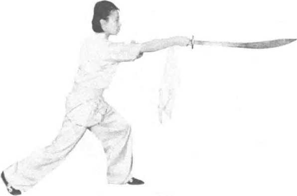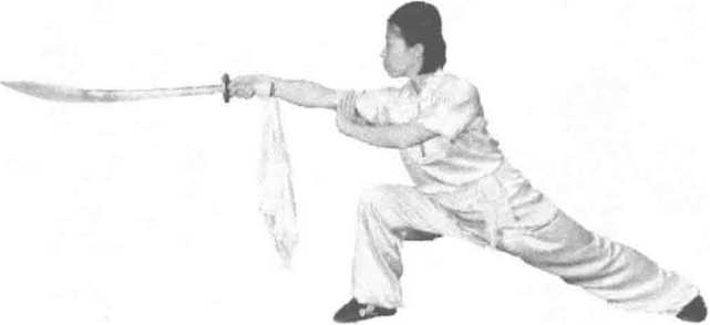练习者两脚开步成右弓步,右手握刀平举于体前,左掌置于右肩前,目视刀 尖方向。(图397)