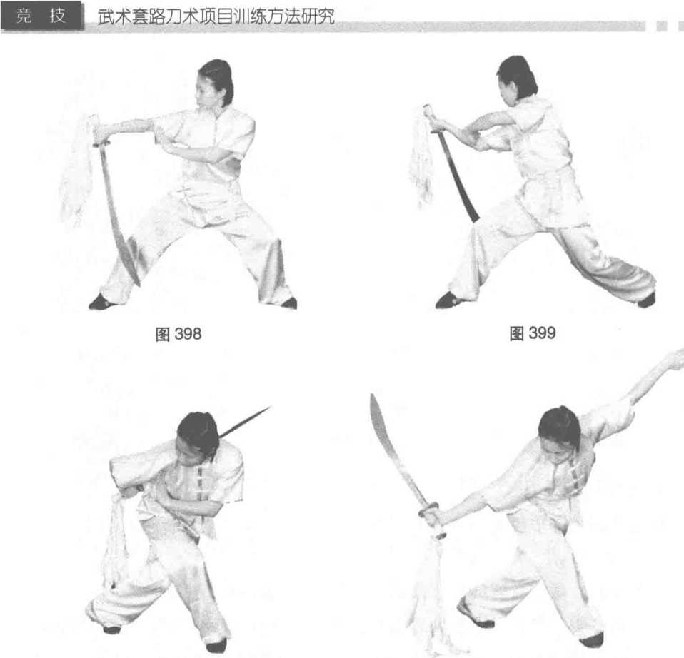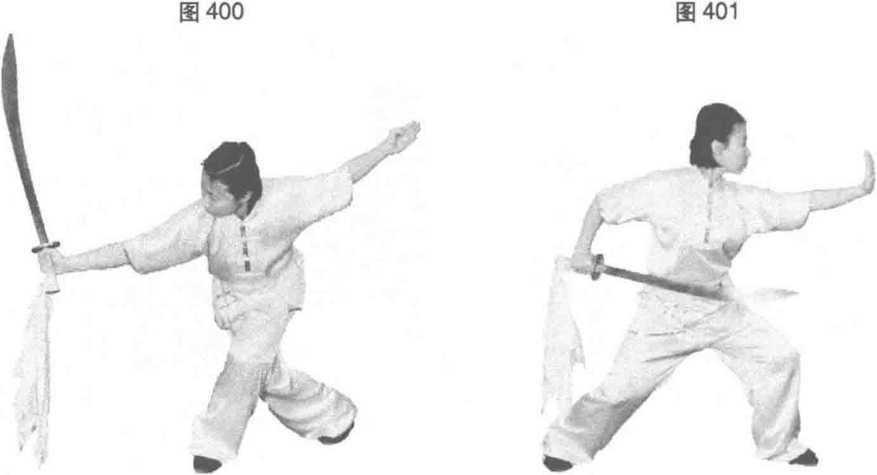 上体左转,做左右剪腕花,目视刀身方向。(图398、图399)
