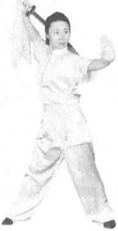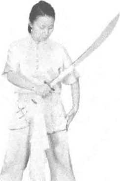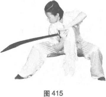 练习者开步站立,刀置于体左侧,左掌附于右腕处,目视前方。(图419)