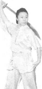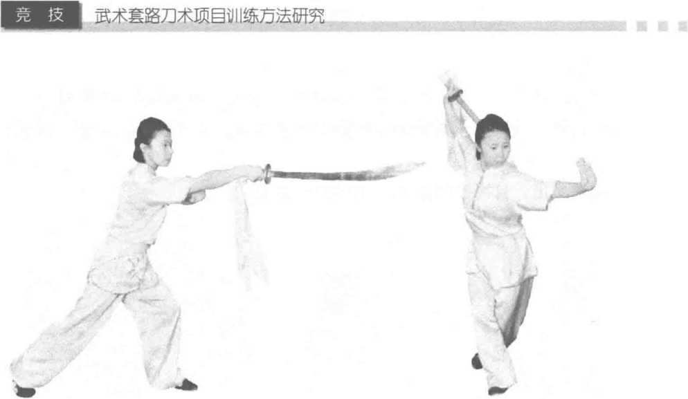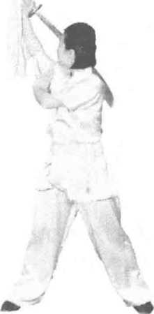 上体微右转,刀向身体右后上方扣腕上摆成背刀,左掌收于右肩前,目视右 后方。
