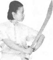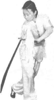 立刀,刀身贴于背部,刀尖斜向下,