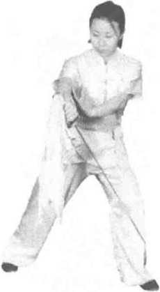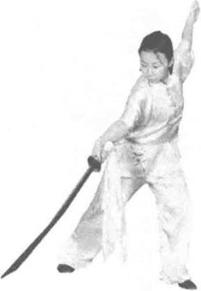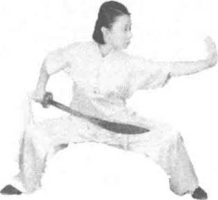 练习者两脚开立成半马步,右手握刀藏刀于腰 间,左掌向前推出,目视推掌方向。(图422)