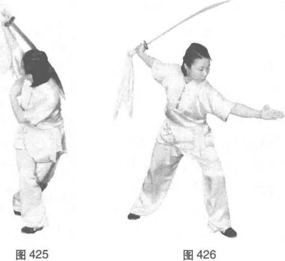右脚蹬地成右弓步,刀向前扎出后,向后收刀经 腰间背刀,左脚向后撤步成插步,左掌随扎刀架于头 顶后收至右肩前,目视收刀方向。(图423、图424)