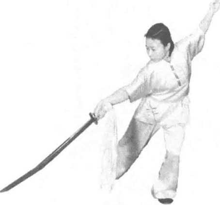 左脚向左开步,刀向前扎出,左掌摆至体后,