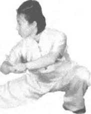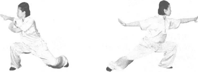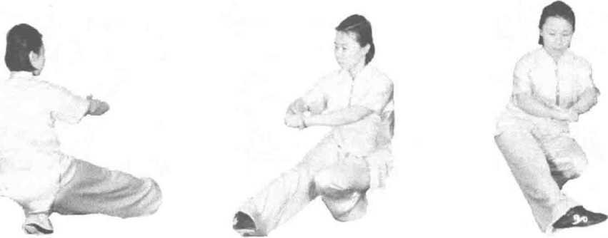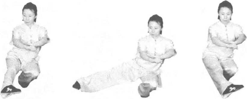左腿屈蹲,右腿伸直,两臂合抱于胸前,右腿悬空,练习左右摆腿。(图