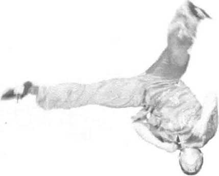 左脚蹬地,右腿从后向上摆起,身 体前屈,在空中向左侧翻动作。右脚先 落地,左脚随之落地。(图511 ~图 513)