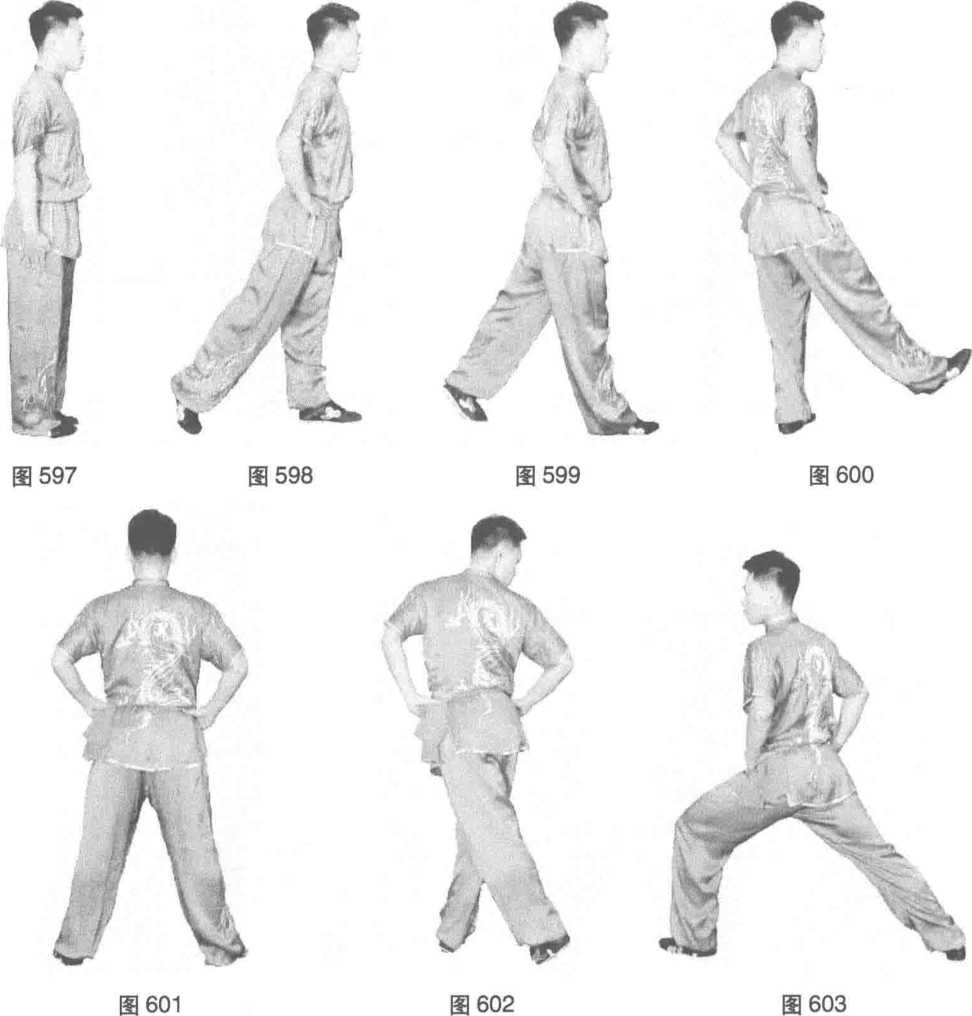 两手叉腰,左脚右脚依次向前上步,然后向前垫步。(图598 ~图600) 上体左转90。,左脚向右脚后撤步成倒插步。(图601、图602) 右脚向右开步成左弓步。(图603)