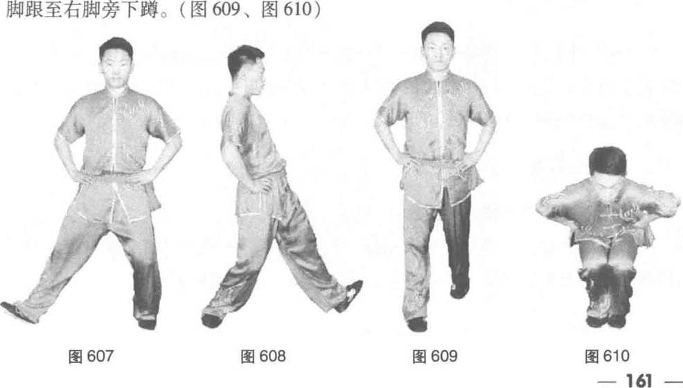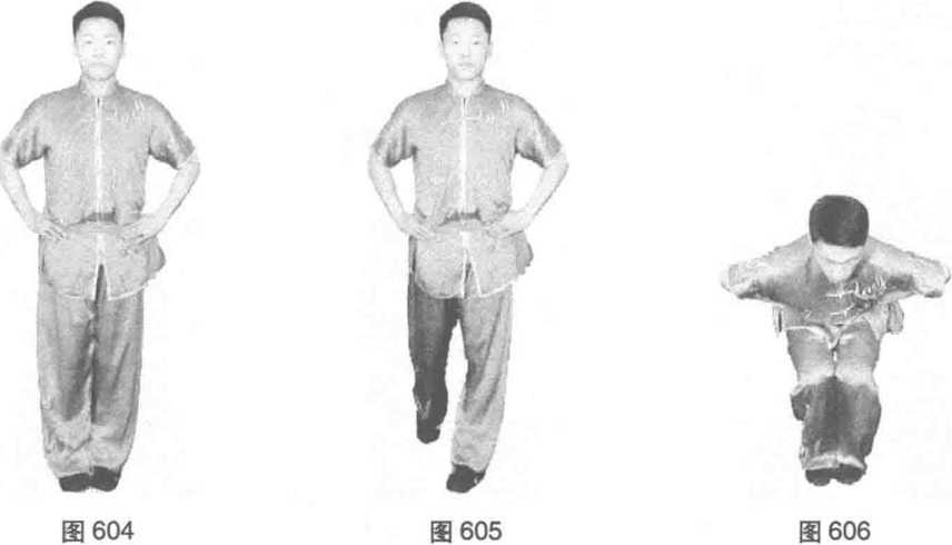 左脚向前上步,同时身体重心下移,右脚跟至左脚旁下蹲。(图605、图606)