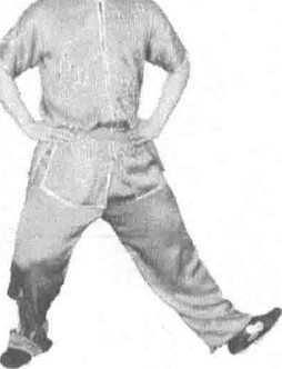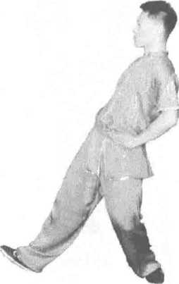 两脚同时向外分开,重心偏于右脚,右腿微屈,脚尖向前。(图611) 重心左移,身体右转90。,右脚脚尖向右外展,身体微后仰。(图612) 重心向右移至两腿中间,目视前方。(图613) 反复练习。