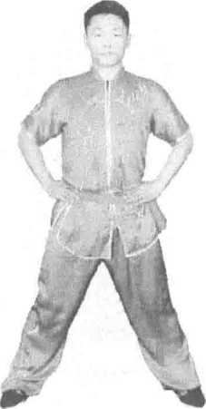 练习者两脚并步站立,双手掐腰,目视前方。(图604)