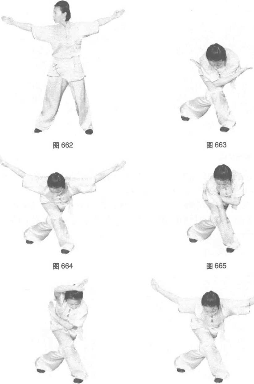 左掌向下经体前向左、向上、向右摆动,同时上体仰身向右翻转360。,目视 前方。(图666 ~图669)