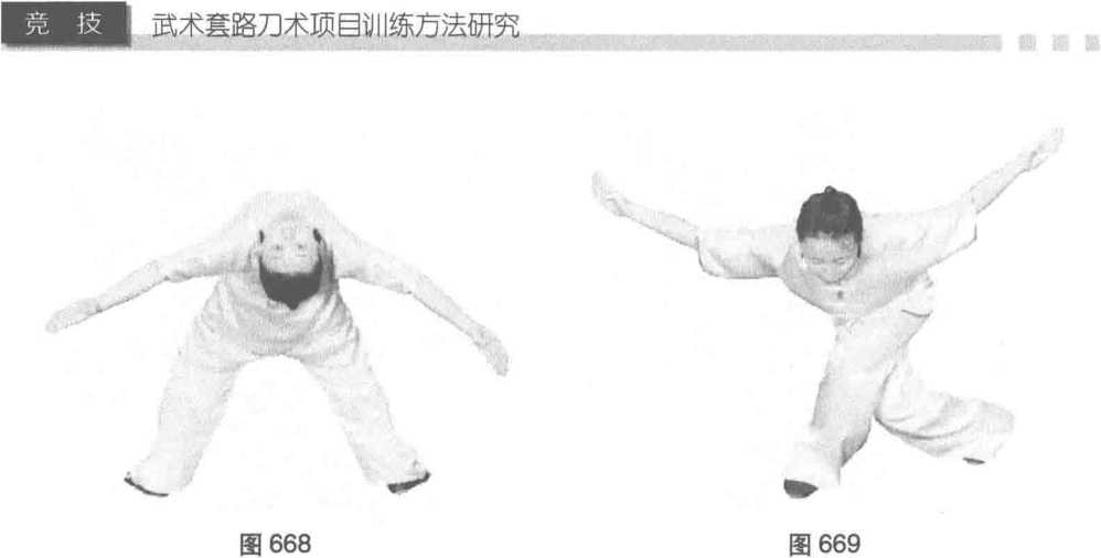 侧身并步站立,左臂体左侧平举,右臂体右侧平举。(图661)
