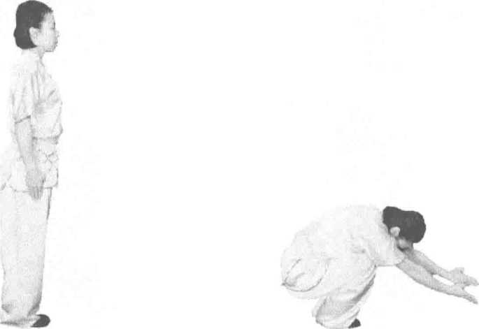 并步站立,左脚向前上步,右脚并于左脚内侧,两腿屈膝下蹲,上体前俯, 两臂由后向上、向前摆臂。(图670、图671)