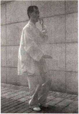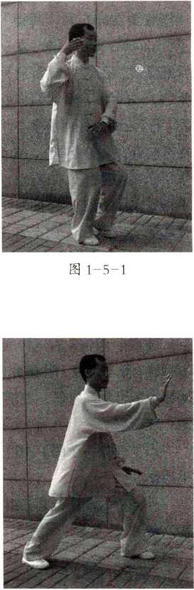 图 1—5—2左脚掌以脚跟为轴向外摆, 脚尖朝正东,重心逐渐移至左 脚;右脚上提至左腿右侧;右腕 上提至右耳侧;左掌朝左膝下 按;眼看正东。